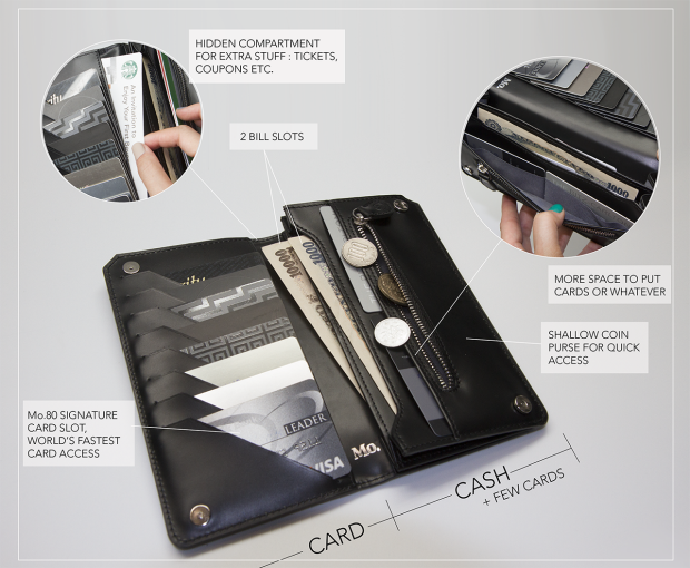 โดดเด่นด้วยฟังก์ชั่นการใช้งานแบบครบครัน  บอกลาชีวิตที่ยุ่งเหยิง ด้วยดีไซน์กระเป๋าที่ออกแบบมาให้ชีวิตง่ายขึ้น ราบรื่น ไม่มีสะดุด ไม่ต้องหยุดควานหาบัตรให้เสียเวลา เพราะ Mo.80 มาพร้อมกับ signature card slot ที่กำลังอยู่ในขั้นตอนการจดสิทธิบัตรออกแบบ การออกแบบได้ใส่ใจการใช้งานที่ง่ายที่สุดเพื่อคุณ ทั้งประหยัดเวลาและถนอมต้นคอ ช่องใส่บัตรที่ใช้ง่าย ไม่เหมือนใคร