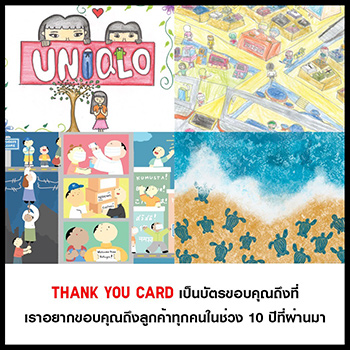 • Thank You Card – การ์ดแทนคำขอบคุณนี้เป็นวัฒนธรรมองค์กรของทางยูนิโคล่ที่ใช้ขอบคุณกันภายในบริษัท Thank You Card เป็นการ์ดขอบคุณใบเล็กๆ ที่แทนคำขอบคุณของยูนิโคล่ ประเทศไทย ผ่านภาพวาดพันธมิตรด้านความยั่งยืนของยูนิโคล่ ประเทศไทย อาทิ สำนักงานข้าหลวงใหญ่ผู้ลี้ภัยแห่งสหประชาชาติ (UNHCR), มูลนิธิบ้านร่มไทร, สถาบันราชานุกูล กรมสุขภาพจิต และมูลนิธิช่วยชีวิตสัตว์ป่าแห่งประเทศไทย (WARF) ที่ไม่เพียงให้ลูกค้าของเราเท่านั้น แต่ยังเป็นการขอบคุณที่ให้ยูนิโคล่เป็นส่วนหนึ่งในการทำประโยชน์เพื่อสังคมไทยขององค์กรเหล่านี้ สำหรับการ์ดขอบคุณนี้ ยูนิโคล่จะมอบให้กับลูกค้าทุกท่านที่ซื้อสินค้ายูนิโคล่ทั้งที่ร้านและออนไลน์ตลอดช่วงแคมเปญฉลองครบรอบ 10 ปี