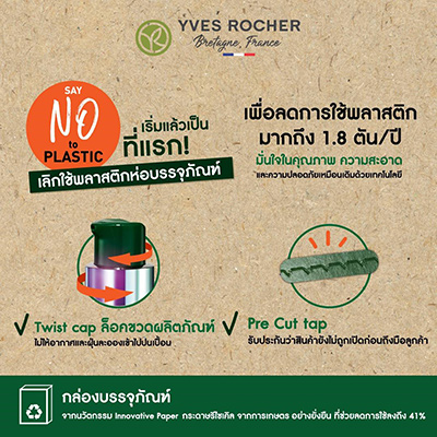 ECO-DESIGNED PACKAGING อีฟ โรเช่ แพคเกจจิ้ง ดีไซน์รักษ์โลก นอกจากจะเป็นสารกัดจาก ธรรมชาติแล้ว เรายังเป็นแบรนด์แรกที่เลิกใช้พลาสติกห่อบรรจุภัณฑ์ เพื่อช่วยลดการใช้พลาสติกถึง 1.8 ตันต่อปี ซึ่งถือเป็นการเปลี่ยน แปลงครั้งยิ่งใหญ่ของวงการสกินแคร์ และกล่องนี้ก็เป็นแพ็คเกจรักษ์ โลกเช่นกัน เพราะเป็นกระดาษรีไซเคิลจากการเกษตรที่ยั่งยืน ช่วย ลดการใช้ทรัพยากรถึง 41%ถือเป็นการเปลี่ยนแปลงครั้งยิ่งใหญ่ ของวงการสกินแคร์ ยังมาพร้อมนวัตกรรมบรรจุภัณฑ์ที่ดียิ่งขึ้น ได้แก่ หัวล็อคแบบ Twist cap ล็อคป้องกันไม่ให้ฝุ่นละอองเข้าไป ปนเปื้อน มั่นใจในความสะอาด รวมทั้งกล่องแบบคัทแท็บที่รับประกัน ได้ว่าสินค้าจะไม่ถูกเปิดก่อนถึงมือลูกค้า |