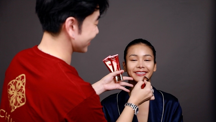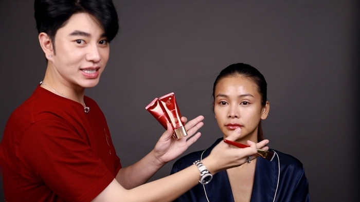 “อยากทำลุคน้องให้สวยมีอินเนอร์แบบ Exotic เบาๆ เป็นผิวที่อาจจะไม่ได้ขาวมาก แต่เป็นผิวเนียนเรียบ แต่งตาน้อยๆ เขียนอินไลเนอร์ ปัดมาสคาร่า เขียนคิ้ว เติมแก้มให้มีความสีระเรื่อ ส่วนสีปากที่ดูเป็นสีธรรมชาติ คือ Reference ลุคนี้คือการแต่งหน้าให้คลีนๆ ดูเป็นธรรมชาติครับ”