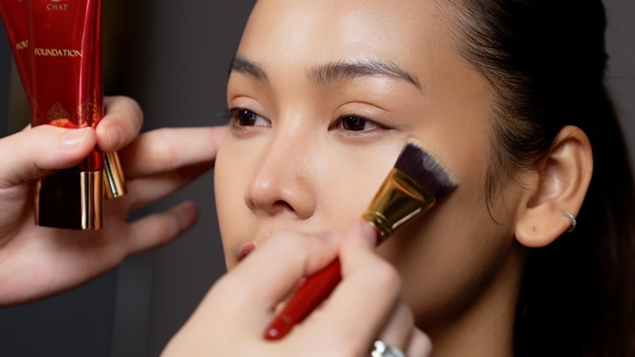 ส่วน วิธีเลือกเฉดรองพื้น "จริงๆ แล้วการเลือกเฉดรองพื้นตามท้องตลาด หรือว่าการหาสีรองพื้นให้เข้ากับผิว เป็นเรื่องหนึ่งที่สำคัญมาก หลายคนเวลาไปที่เคาน์เตอร์จะชอบเทสรองพื้นบริเวณช่วงหลังมือ หรือว่าบริเวณช่วงตรงอุ้งมือ แต่คราวนี้หลักการง่ายๆ ถ้าเกิดเราอยากเทสรองพื้นให้ได้สีใกล้เคียง อยากให้ลองเทสกับบริเวณคาง ที่มีพื้นผิวชิดกับใบหน้าที่สุด หรือว่าบริเวณช่วงคอที่มันอยู่ชิดกับใบหน้าที่สุด เพราะว่าเราจะเห็นสีผิวจริง