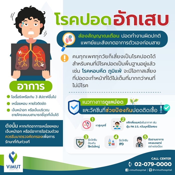 วันนี้ รศ.นพ. ธีระศักดิ์ แก้วอมตวงศ์ แพทย์ผู้เชี่ยวชาญโรคระบบการหายใจและเวชบำบัดวิกฤต ศูนย์อายุรกรรม รพ.วิมุต จะมาไขข้อข้องใจในเรื่องโรคต่าง ๆ ที่เกี่ยวกับปอด รวมไปถึงประชากรกลุ่มเสี่ยง ปัจจัยกระตุ้น และปัจจัยส่งเสริมให้เกิดโรค สัญญาณอันตรายที่ไม่ควรมองข้าม ไปจนถึงแนวทางป้องกันโรคปอดที่ทุกคนพึงสามารถทำได้ อย่างเช่น การดูแลสุขภาพปอด หลีกเลี่ยงมลพิษทางอากาศ (air pollutants) หลีกเลี่ยงสารก่อภูมิแพ้ (aeroallergen) ในผู้ป่วยโรคหืดและกลุ่มเสี่ยง รวมทั้งการงดสูบบุหรี่ (smoking cessation) และ การฉีดวัคซีน (vaccine) เพื่อป้องกันโรคติดเชื้อทางเดินหายใจ เช่นไข้หวัดใหญ่ (influenza) และป้องกันการติดเชื้อปอดอักเสบจากเชื้อแบคทีเรียนิวโมค็อกคัส ( pneumococcus) เป็นต้น