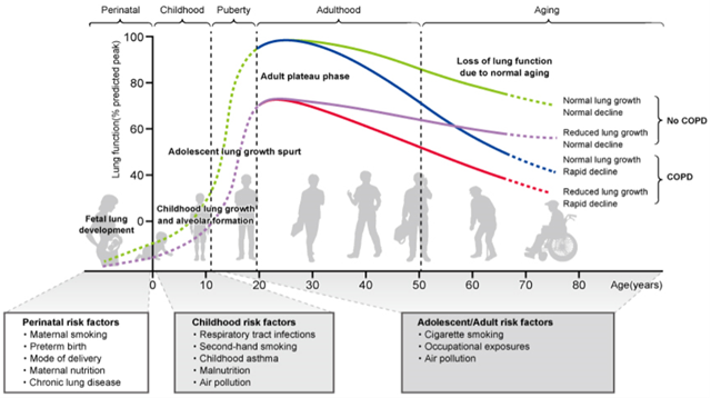 “ปอดของมนุษย์ไม่ได้เจริญเติบโตอย่างสมบูรณ์มาตั้งแต่แรกเกิด เพราะสมรรถภาพปอดที่ดี ต้องอาศัยการเจริญเติบโตที่ดีต่อเนื่องตั้งแต่ในครรภ์ แรกเกิดและในวัยเด็ก (prenatal and perinatal period) ปอดมีพัฒนาการอย่างเต็มที่ในช่วงอายุ 20-25 ปี หลังจากนั้น จะเริ่มคงที่และค่อย ๆ เสื่อมลงตามวัย (aging lungs) แต่เสื่อมเร็วหรือช้า ขึ้นอยู่กับหลากหลายปัจจัยที่มีผลกระทบ เช่น มลพิษทางอาการหรือหรือติดเชื้อในระบบทางเดินหายใจ ” รศ.นพ. ธีระศักดิ์ แก้วอมตวงศ์ อธิบาย “ในแง่ของกรรมพันธุ์ ประชากรที่มีโรคปอดหรือโรคระบบทางเดินหายใจเป็นพื้นฐานอยู่แล้ว เช่น โรคหืด หรือ ภูมิแพ้ระบบทางเดินหายใจ มีโอกาสที่ปอดทำหน้าที่ไม่เท่ากับประชากรปกติ นอกจากนี้ ทารกคลอดก่อนกำหนด หรือทารกแรกเกิดที่ตัวเล็กน้ำหนักตัวน้อยก็อาจมีพัฒนาการของปอดที่ไม่ดี อีกปัจจัยหนึ่ง คือคนไข้ที่มีอาการติดเชื้อในปอดแบบเป็น ๆ หาย ๆ การทำงานของปอดก็มีโอกาสเสื่อมถอยลงได้รวดเร็วขึ้น ประกอบกับเมื่อผู้ป่วยดังกล่าวสัมผัสกับปัจจัยกระตุ้น เช่น ควันบุหรี่ หรือมลพิษทางอากาศ เช่นฝุ่นขนาดเล็กในอากาศ (particulate matter 2.5 หรือ PM 2.5)nทำให้ปอดที่ไม่ดีอยู่แล้ว เกิดเสื่อมถอยของสมรรถภาพปอดเร็วมากขึ้นไปอีก” ดังรูป