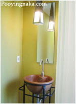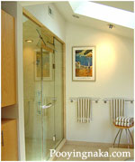 กำหนดให้ห้องน้ำเปิดโล่งมองเห็นธรรมชาติภายนอกได้ เพราะต้องแบ่งโซนส่วนหนึ่งไว้สำหรับจัดวางต้นไม้ ทำผนังด้านนั้นให้เป็นซีเมนต์เปลือย หรือผนังศิลาแลง ถัดเข้ามาเป็นพื้นที่จัดวางเครื่องสุขภัณฑ์ต่างๆ อาจจะติดผนังกระจกใสเพื่อแบ่งกั้นโซนสำหรับการใช้งานนี้ให้เป็นสัดเป็นส่วน