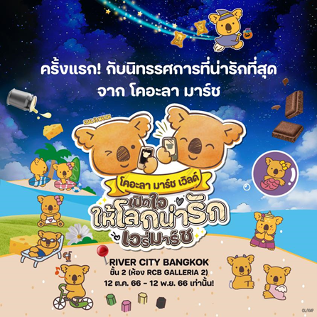 12 ตุลาคม - 12 พฤศจิกายน 2566 นี้ อย่าพลาด! นิทรรศการ ‘โคอะลา มาร์ช เวิลด์ เปิดใจให้โลกน่ารักเวรี่มาร์ช’ ที่จะทำให้คุณมูฟออนจากความน่ารักของพี่มาร์ช คุง ไม่ได้เลย มาเติมความสดใสในโลกของคุณ ได้ที่ ริเวอร์ ซิตี้ (River city) ชั้น 2 ห้อง RCB Galleria 2 หรือ Add Line : Koalas-march หรือ http://bit.ly/3MASbQg  เพื่อร่วมสนุกและแลกของรางวัลสุดเอ็กซ์คลูซีฟหน้างาน พร้อมให้ความน่ารักของโคอะลา มาร์ช ได้กลายเป็นอีกส่วนหนึ่งของความสดใสในโลกของคุณ! และติดตามข่าวสารได้ที่เพจ https://www.facebook.com/ilovekoalamarch