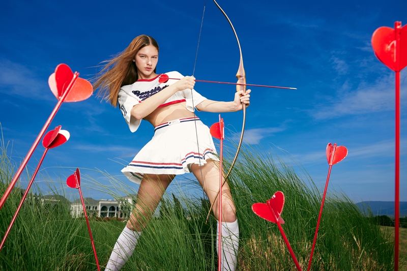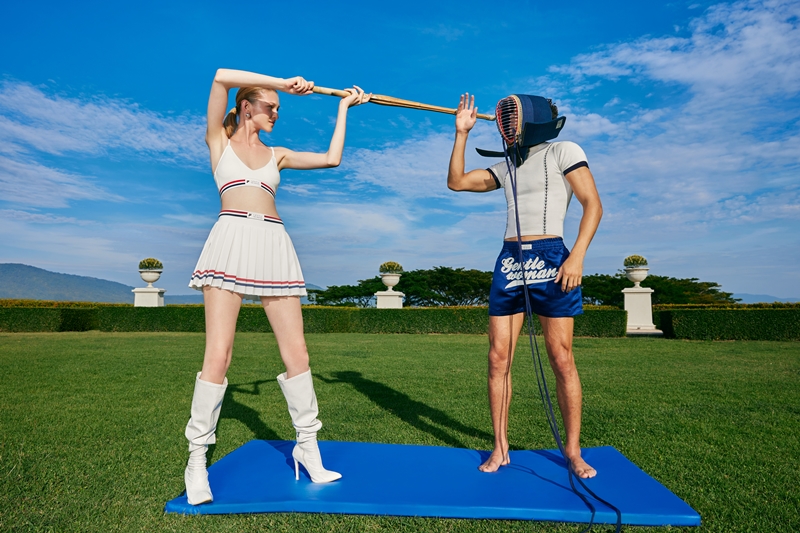 อิทธิพลของเทรนด์ประจำฤดูกาล Autumn - Winter 23/24 อย่างเทรนด์สปอร์ตที่กำลังเป็นที่นิยมอย่างแพร่หลายในปัจจุบัน และเทรนด์ Nostalgia ที่มีกลิ่นอายของความย้อนยุค ถูกนำมาเป็นแรงบันดาลใจในการสร้างสรรค์ที่สะท้อนอยู่ภายใต้คอนเซปต์ ‘Sportique Serenity’ โดยมีการดัดแปลงดีเทลเล็กๆ ปรับซิลูเอทให้มีความร่วมสมัย สื่อสารผ่านโครงสร้างของเสื้อผ้าที่ให้กลิ่นอายของความเรียบง่าย สลับกับโครงสร้างเสื้อผ้าที่ดูแฟชั่น แล้วทวิสต์เพิ่มสีสันสนุกๆ ถ่ายทอดออกมาเป็นแฟชั่นสปอร์ตแวร์ที่ไม่ได้มีไว้ใส่ไปออกกำลังกายแบบที่คุ้นเคย ซึ่งมีดีเทลโดดเด่นอย่าง การนำกิมมิค และการเลือกใช้ฟ้อนต์แบบที่เห็นในกีฬาเทนนิสมาใช้ ตลอดจนการนำกระโปรงพลีทซึ่งเห็นได้จากเครื่องแต่งกายของผู้เล่นเทนนิสมาปรับแต่งให้ดูแฟชั่นมากขึ้น รวมไปถึงการนำกางเกงมวยมาทำให้กลายเป็นไอเท็มแฟชั่น ผสมผสานไปกับเทคนิคการทำชิ้นงาน อย่างการปัก การทอ และการเล่นเลเยอร์ต่างๆ ทำให้การมิกซ์แอนด์แมทช์ในแต่ละลุคเต็มไปด้วยความสนุกสนานและมีชีวิตชีวา