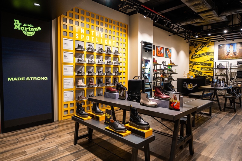 Dr. Martens สาขาใหม่ล่าสุด นอกจากความโดดเด่นเรื่องการดีไซน์ร้านที่ผสมผสานรวมดีเอ็นเอเฉพาะของแบรนด์และจุดเด่นเรื่องโทนสีร้านแล้ว ยังถูกเติมเต็มไปด้วยสินค้าที่ไลฟ์สไตล์น่าสนใจในแต่ละหมวดหมู่ อาทิ โซนรองเท้าชายและหญิง, รองเท้ายูนิเซ็กซ์, กระเป๋า, ถุงเท้า และ เชือกผูกรองเท้า พร้อมรับชมโซนไฮไลต์ภายในร้านอย่าง “In the Spotlight” มุมจัดแสดงรองเท้าบนแผงดีไซน์สีเหลือง-ดำ เสริมเอกลักษณ์เพิ่มความโดดเด่นด้วยไฟตัวอักษรประดับ LED ซึ่งคอลเลกชันที่จะนำมาจัดแสดงจะเป็นรองเท้ารุ่นที่ได้รับความนิยมระดับตำนาน เต็มไปด้วยกลิ่นอายแห่งประวัติศาสตร์ที่น่าสนใจถึง 4 รุ่น ได้แก่