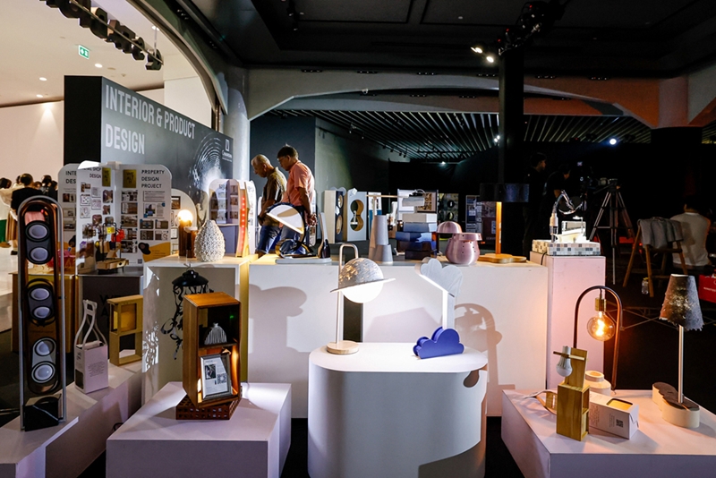 นอกจากนี้มีภายในงานมีการแสดงผลงานศิลปนิพนธ์ของนักศึกษาสาขาออกแบบตกแต่งภายในและผลิตภัณฑ์ (Interior & Product Design) อาทิ “LUXON” โคมไฟตั้งโต๊ะที่ได้รับแรงบันดาลใจจากปลั๊กชาร์จของ TESLA และมีฟังก์ชันแบบ 2-in-1 เป็นโคมไฟตั้งโต๊ะสำหรับอ่านหนังสือหรือทำงาน และไฟฉายพร้อมแบตเตอรี่แบบชาร์จ USB มีระบบควบคุมแบบสัมผัสและทำจากพลาสติกไนลอนที่ทนทานพร้อมโครงสร้างไฟเบอร์กลาส, “THE CLOUD” โคมไฟสร้างพื้นที่ทำงานที่มีบรรยากาศเงียบสงบ ได้รับแรงบันดาลใจจากเมฆ โดยมีเฉดสีฟ้าและแสงไฟนวลตาชวนให้นึกถึงท้องฟ้าที่แจ่มใส ในออฟฟิศสีน้ำเงินมักสื่อถึงความสงบ และความเป็นมืออาชีพ แนวคิดนี้รวมเอาโคมไฟรูปเมฆ การตกแต่งด้วยสีฟ้า และองค์ประกอบการออกแบบโดยรวมเพื่อสร้างสภาพแวดล้อมที่สงบสุขและมีประสิทธิภาพ โคมไฟทำจากไม้สร้างบรรยากาศที่เป็นธรรมชาติ พื้นผิวไม้ช่วยเพิ่มสัมผัสแห่งความเรียบง่าย และผลงานการออกแบบตกแต่งภายในสำนักงาน “THE CLOUD” โดยแนวคิดมาจากการออกแบบสำหรับออฟฟิศของ Disney คือการสร้างพื้นที่ ที่เต็มไปด้วยพลังงานบวกและแรงบันดาลใจให้กับผู้ที่ทำงานในสถานที่นี้ โดยการผสมผสานพื้นที่สีเขียว และการใช้แสงจากธรรมชาติร่วมกับแสงสังเคราะห์ และ “RETAIL SHOP FOR RALPH LAURENT STORE” ได้รับแรงบันดาลใจและแนวคิดในการออกแบบมาจากร้าน Ralph Laurent มีกลิ่นอายความคลาสสิค และผสมกับการใช้ซุ้มโค้ง ทำให้ภายในร้านดูไม่แข็งจนเกินไปและมีความน่าสนใจมากยิ่งขึ้นด้วยการใช้ลายแพทเทิร์นตารางบนพื้นตัดกับซุ้มโค้ง