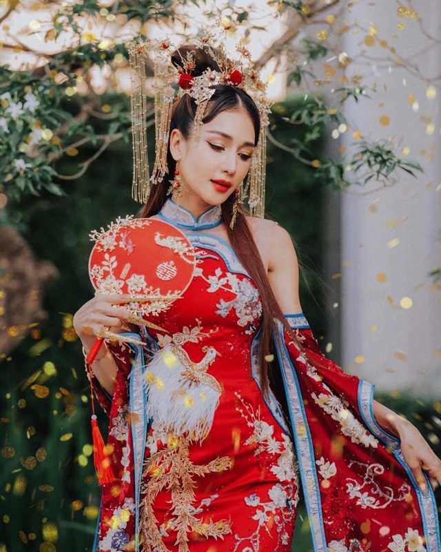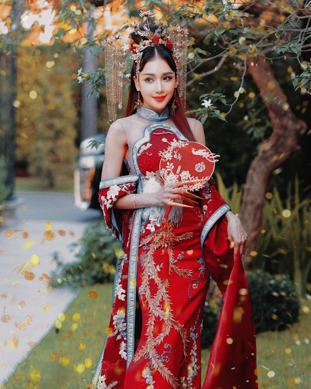ปิดท้ายด้วยชุดจีนประยุกต์สีแดงงามล้ำลุคนางพญา ที่ทางห้องเสื้อดีไซน์ออกมาให้เหมาะกับสาวสวยสุดเซ็กซี่อย่าง  “เนย โชติกา วงศ์วิลาศ” โดยเฉพาะ เพื่อต้อนรับความเฮงความปัง เนื่องในโอกาสเทศกาลตรุษจีนที่ผ่านมา เป็นชุดจีนที่เรียกเสียงฮือฮาและสร้างความประทับใจให้กับสาวๆเลือดผสมไทยจีนได้ไม่น้อยทีเดียว ด้วยดีไซน์ที่มีความแตกต่างเหมาะสมกับยุคสมัย ลวดลายงานปักบนผืนผ้าที่บ่งบอกถึงมูลค่าและความประณีตที่ส่งเสริมรสนิยมของผู้สวมใส่ได้อย่างดี ทำให้เป็นผลงานที่ได้รับความสนใจมากทีเดียวโดยเฉพาะในกลุ่มของว่าที่เจ้าสาวที่ต้องการ ชุดจีน หรือ ชุดยกน้ำชา ที่มีเอกลักษณ์ไม่ซ้ำใครแบบนี้