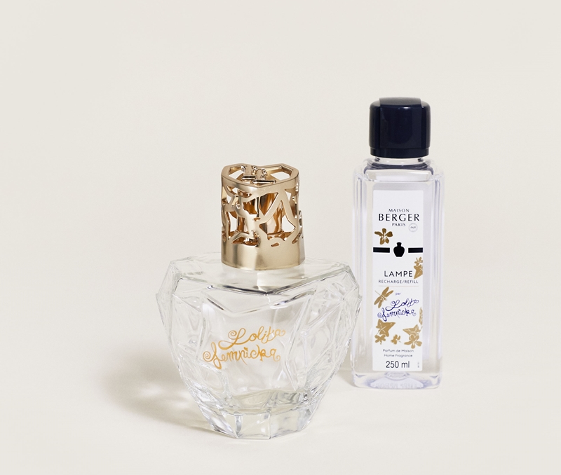 ตะเกียงน้ำหอม Lolita Lempicka Pure Lamp Set มาพร้อมน้ำหอมกลิ่น Lolita Lempicka ปริมาณ 250 มิลลิลิตร มีให้เลือก 2 สี ได้แก่ สีม่วง และ สีใส ตัวตะเกียงเป็นรูปทรงโค้งมนคล้ายผลแอปเปิ้ลแทนความโรแมนติกจากเรื่องราวของ Adam & Eve ผลิตจากแก้วชั้นดี ประดับตราลายเซ็นของนักออกแบบด้วยอักษรสีทอง ตกแต่งด้วยลวดลายใบไอวี่สีทอง ประกอบกับฝาครอบสีทองฉลุลวดลายไม้เลื้อย ให้ความรู้สึกมหัศจรรย์ราวกับอยู่ในเทพนิยาย
