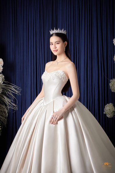 ชุดพิธีหมั้น ถูกออกแบบให้งามสง่าอ่อนหวานในสไตล์คลาสสิก เสริมลุคให้ดูแพงด้วยผ้าไหมเนื้อดีปักลูกไม้ประดับคริสตัลแวววาว ให้เจ้าสาวส่องประกายในวันสำคัญ