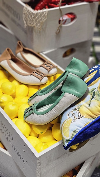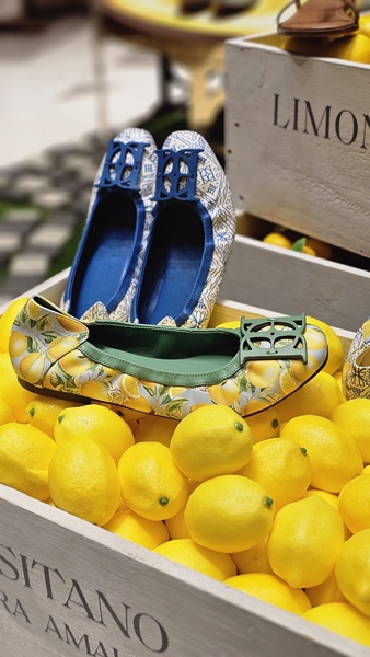 รองเท้าแฟลตหนังแกะแท้ทรงซิกเนเจอร์อย่าง Audrey Ciao ที่สะท้อนเสน่ห์แห่ง Positano ผ่านดีไซน์ลวดลายพิมพ์พิเศษและงานปักลายเลม่อน ลายกระเบื้อง รวมทั้งลายสัตว์ทะเล ผสมผสานเข้ากับโทนสีที่เข้ากับบรรยากาศของอิตาลี ทั้งหมด 7 ลายได้แก่ ITALIAN BLUE, LIMONCELLO, GRANITA GREEN, CAPRI BROWN, SEAFOOD RISOTTO, SEAFOOD BROWN และ LIMONE COSTA  เพื่อให้ทุกท่านพร้อมออกเดินทางไปสัมผัสบรรยากาศในซัมเมอร์นี้