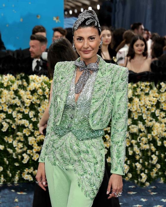 จิโอวานน่า อิงเกอเบิร์ท ถ่ายทอดธีมแดนดี้ (Dandy) ออกมาได้อย่างสมบูรณ์แบบด้วยทักซิโด้สีเขียวสามชิ้นสุดเนี้ยบ ซึ่งเป็นการตีความเดรสโค้ดในแบบฉบับของเธอที่ผสานความเป็นปัจเจกและงานศิลป์อันวิจิตรได้อย่างลงตัว ลวดลายขนนกบนผ้าออร์แกนซ่าถูกประดับด้วยคริสตัลเหลี่ยมเจียระไนกว่า 200,000 เม็ดและ Swarovski Crystal Pearls คลุมทั่วทั้งตัวแจ็คเก็ตและกางเกง ขณะที่เสื้อจิเลตตัวในดูโดดเด่นด้วยลายปักคริสตัลแบบก้างปลา (chevron)