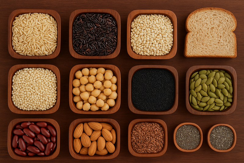 การเลือกรับประทาน คาร์โบไฮเดรตเชิงซ้อน เช่น ข้าวกล้อง ข้าวไรซ์เบอร์รี ควินัว ข้าวโอ๊ต ข้าวบาร์เลย์ ขนมปังโฮลวีต ถั่วและเมล็ดพืช เช่น ถั่วแดง ถั่วดำ ถั่วเขียว ถั่วลูกไก่ อัลมอนด์ งาดำ เมล็ดฟักทอง แฟลกซ์ซีด เมล็ดเจีย เป็นต้น ช่วยลดภาวะดื้อต่ออินซูลิน และส่งเสริมวงจรการตกไข่ อ้างอิงงานวิจัยของ Eslamian และ Hekmatdoost ที่ตีพิมพ์ในวารสาร Journal of Human Nutrition and Dietetics (J Hum Nutr Diet) ปี 2017 รายงานว่า การบริโภคอาหารที่มีคาร์โบไฮเดรตเชิงซ้อนสูง เช่น ธัญพืชไม่ขัดสี ถั่ว และอาหารที่อุดมด้วยใยอาหาร ควบคู่กับการลดคาร์โบไฮเดรตขัดสี การควบคุมระดับน้ำตาล (GI) ให้ต่ำลงสามารถช่วยเพิ่มความไวต่ออินซูลินและบรรเทาอาการ PCOS ได้ ซึ่งสอดคล้องกับงานวิจัยของ Phy JL และคณะ ที่เผยแพร่ในวารสาร Journal of Obesity & Weight Loss Therapy ปี 2015 ชี้ให้เห็นว่า การควบคุมอาหารแบบลดแป้งและนมเป็นเวลา 8 สัปดาห์ ส่งผลให้น้ำหนักลดลง ความไวต่ออินซูลินดีขึ้น และระดับฮอร์โมนเทสโทสเตอโรนลดลงในผู้หญิงที่มีภาวะถุงน้ำในรังไข่หลายใบ (PCOS) อย่างมีนัยสำคัญ