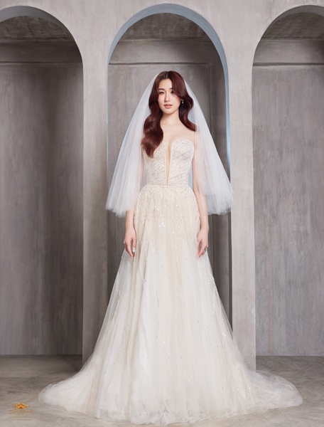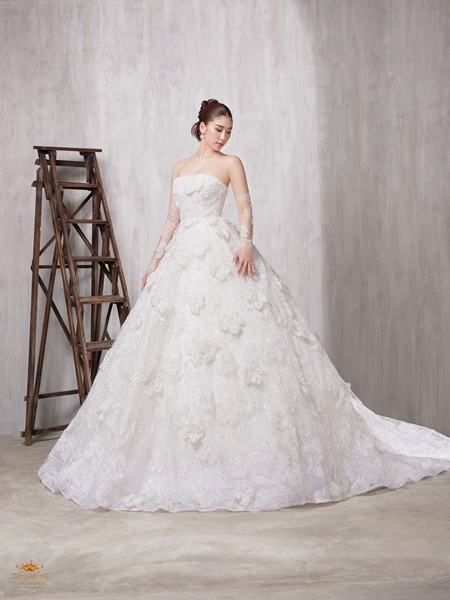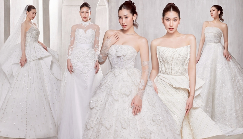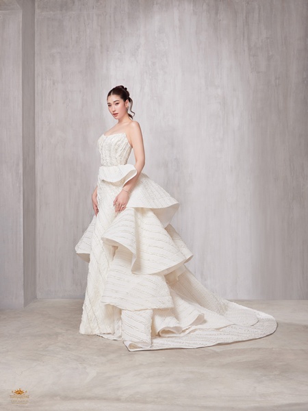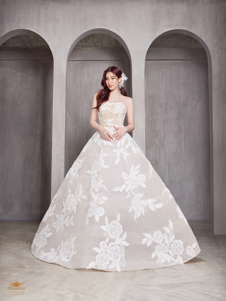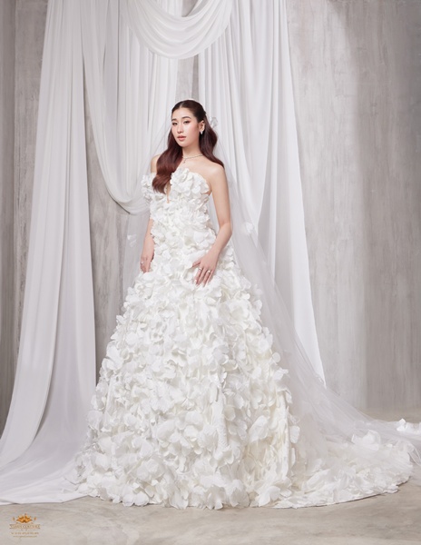 ปิดท้ายด้วยชุดเกาะอกทรง A-line ตัวนี้คือผลงานระดับโอต์กูตูร์ ที่ออกแบบและจัดวางกลีบดอกไม้นับพันอย่างประณีต เพื่อสะท้อนความหรูหรา อ่อนหวาน และอ่อนโยน ดั่งเจ้าสาวผู้มีหัวใจบริสุทธิ์ ดีไซน์อันเป็นเอกลักษณ์นี้ผสมผสานความเป็น Couture เข้ากับ ความรักที่ลึกซึ้งดั่งเทพนิยาย งานดีไซน์ที่ไม่เหมือนใคร มีเพียงหนึ่งเดียวในประเทศไทยเท่านั้น