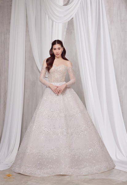 ชุดที่ 4 ชุดแต่งงานทรงปาดไหล่แขนยาว เรียบหรูแต่แฝงไว้ด้วยความละมุนละไม โดดเด่นด้วยกระโปรงทรง A-Line ที่ออกแบบด้วยโครงสร้างแบบฝรั่งเศสแท้ จุดเด่นอันเลอค่าคือการตัดเย็บที่ไม่พึ่งพาผ้าโครงอยู่ตัวแบบดั้งเดิม แต่เลือกใช้เทคนิคเฉพาะที่คิดค้นขึ้นใหม่โดยแบรนด์ Vanus Couture เพื่อให้ชุดมีโครงสร้างสมบูรณ์แบบ คงตัวได้โดยไม่ต้องใส่โครงแข็ง ตกแต่งด้วยลวดลาย ปักดอกไม้ยิปโซและยิปซีอย่างละเอียด วิบวับด้วยการปักคริสตัลและเลื่อมเม็ดจิ๋วที่กระจายตัวเป็นเคิร์ฟอย่างมีจังหวะ คล้ายละอองดาวบนพื้นผืนผ้า เนื้อผ้า      สีอ่อนที่โปร่งแสงบางเบา ให้ความรู้สึกล่องลอยแต่มั่นคงทุกการเคลื่อนไหวเป็นลุคที่ผสมผสานความโรแมนติกและความสง่างามเข้าไว้ด้วยกันอย่างสมบูรณ์แบบ ชุดนี้เหมาะสำหรับเจ้าสาวผู้หลงใหลในความเรียบหรู หวานแต่มีพลัง และรักความแตกต่างอย่างมีรสนิยม