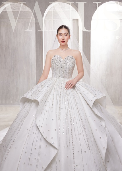 ชุดที่ 6 ชุดแต่งงานทรงปริ๊นเซสเกาะอกสุดตระการตา ที่ได้แรงบันดาลใจจากเจ้าหญิงยุโรปผู้สูงศักดิ์ ผสานความหรูหราเข้ากับดีไซน์ร่วมสมัยได้อย่างลงตัว ไฮไลต์ที่สุดของความเลอค่าของชุดนี้ ได้รังสรรค์จาก ผ้ามินิมอลที่เป็นงานปักทั้งตัว และประดับคริสตัลมากกว่า 10,000 เม็ดทุกเม็ดถูกจัดวางอย่างมีศิลปะ ไล่ระดับแสงเงาให้องค์รวมดูเจิดจรัสทุกองศา เมื่อเจ้าสาวเคลื่อนไหว ชุดจะเปล่งประกายราวกับถูกสะกดด้วยแสงดาวบนท้องฟ้ายามค่ำคืน บริเวณเกาะอกถูกออกแบบพิเศษด้วยเทคนิค “ทวิต” (Twist) เพื่อให้เกิดเทกซ์เจอร์ที่แตกต่าง สร้างเลเยอร์มิติให้ตัวชุดดูมีพลัง สวยหรูแบบสง่างามไม่จำเจ ชุดนี้คือคำตอบของเจ้าสาวผู้ใฝ่ฝันถึงลุค “ราชนิกุลผู้เลอค่า” ที่ใครเห็นเป็นต้องประทับใจ และเหมาะกับงานแต่งงานสุดอลังในโบสถ์ โรงแรม หรือปราสาทในฝัน