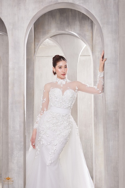 ชุดที่ 7 ชุดแต่งงานทรง Mermaid เกาะอกทรงสวีตฮาร์ต ที่ออกแบบมาเพื่อเจ้าสาวผู้ต้องการความคลาสสิกแต่ไม่ธรรมดา ไฮไลต์ของชุดนี้โดดเด่นด้วย เคปกระโปรงด้านหลัง ที่เพิ่มวอลุ่มให้ช่วงล่างดูสง่าพริ้วไหว เพิ่มความอลังการเมื่อเจ้าสาวเดินเข้าสู่พิธี เปรียบดั่งเจ้าหญิงที่ก้าวออกจากปราสาทหินขาวแห่งยุโรป ส่วนบนของชุดออกแบบเป็นเกาะอกทรงหวานสไตล์ Sweetheart เสริมลูกไม้ฝรั่งเศสชั้นดีที่ถักทอเป็นแขนยาวซีทรู พร้อมดีไซน์คอปีนสุดหรู ที่ถอดแบบมาจากลุคเจ้าหญิงในราชวงศ์อังกฤษ ปักตกแต่งด้วยลวดลายดอกไม้         สามมิติเบาๆ ที่ช่วยขับให้ช่วงตัวดูงดงามสมสัดส่วน เหมาะกับงานแต่งงานในโบสถ์ หรือสถานที่สุดคลาสสิก และเจ้าสาวผู้ต้องการลุคที่ดูสูงศักดิ์ หรูหรา สง่างามทุกย่างก้าว