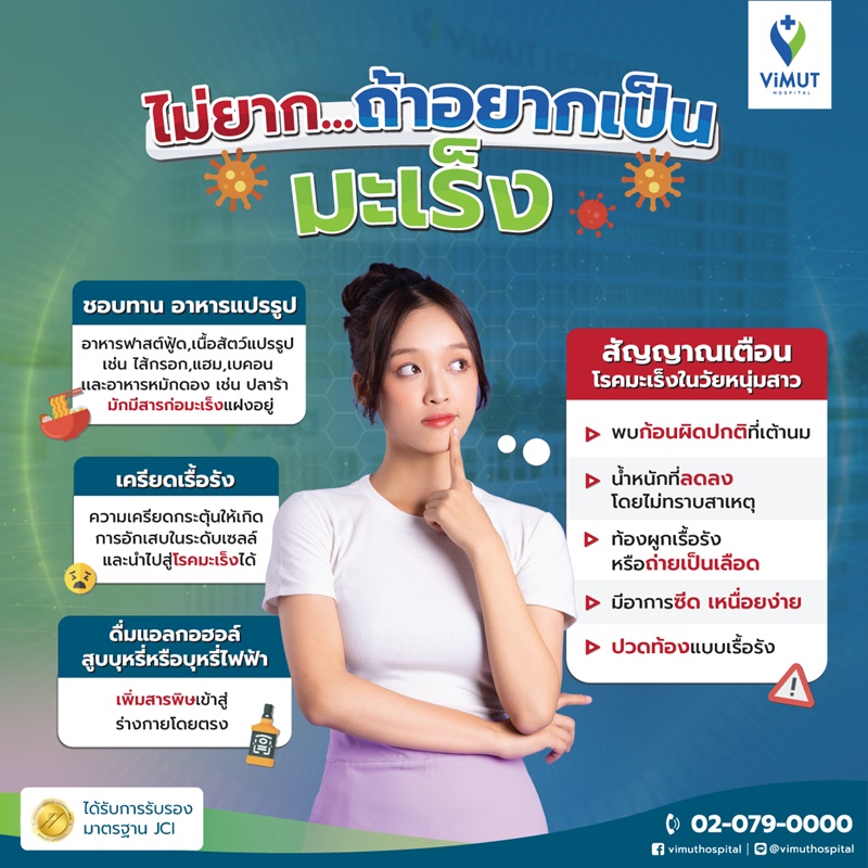 คนอายุน้อยในกลุ่มวัยทำงานมักมีไลฟ์สไตล์ที่ทำลายสุขภาพ เช่น นอนดึก พักผ่อนไม่เพียงพอ หรือเข้านอนไม่เป็นเวลา ซึ่งล้วนส่งผลต่อระบบฮอร์โมนและภูมิคุ้มกันของร่างกาย และเกี่ยวข้องโดยตรงกับความเสี่ยงของมะเร็งหลายชนิด อีกหนึ่งปัจจัยสำคัญคือเรื่องอาหาร ด้วยชีวิตที่เร่งรีบทำให้หลายคนเลือกกิน อาหารแปรรูป ที่หาซื้อได้สะดวก เช่น ไส้กรอก บะหมี่กึ่งสำเร็จรูป อาหารแช่แข็ง หรือฟาสต์ฟู้ด ที่มักมีสารก่อมะเร็งแฝงอยู่ แถมยังมีปริมาณไขมันและโซเดียมสูงซึ่งไม่ดีต่อร่างกาย และหากกินบ่อยโดยไม่ออกกำลังกายก็อาจทำให้เกิดภาวะน้ำหนักเกินซึ่งส่งผลให้ภูมิคุ้มกันของร่างกายอ่อนแอลงเช่นกัน นพ.ดุลยทรรศน์ อนันตะยา อายุรแพทย์มะเร็งวิทยา ศูนย์อายุรกรรม รพ.วิมุต อธิบายเพิ่มเติมว่า “คนทำงานส่วนใหญ่มักมีความเครียดอยู่แล้ว แต่ถ้าจัดการความเครียดไม่ดีก็อาจกลายเป็นภาวะ เครียดเรื้อรัง ซึ่งเป็นอีกหนึ่งความเสี่ยงที่หลายคนมองข้าม เพราะอาจกระตุ้นให้เกิดการอักเสบในระดับเซลล์ และนำไปสู่โรคมะเร็งได้ ยิ่งบางคนที่คลายเครียดด้วยการดื่มแอลกอฮอล์ สูบบุหรี่หรือบุหรี่ไฟฟ้า ซึ่งเป็นการเพิ่มสารพิษเข้าสู่ร่างกายโดยตรง ก็เป็นอีกหนึ่งสาเหตุสำคัญของโรคมะเร็ง ดังนั้น แม้ร่างกายของคนวัยทำงานจะยังดูแข็งแรงดี แต่หากยังทำพฤติกรรมเสี่ยงเหล่านี้ซ้ำ ๆ สะสมต่อเนื่องเป็นเวลาหลายปี โรคมะเร็งก็อาจมาเยือนได้โดยไม่ทันตั้งตัว”