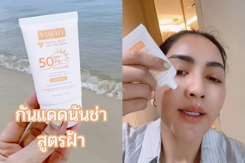 1.นันช่า รอยัล เจลลี่ แอนตี้ เมลาสมา ซัน โพรเทคชั่น (NANCHA ROYAL JELLY ANTI MELASMA SUN PROTECTION) – พัฒนาขึ้นสำหรับผู้ที่มีความกังวลเรื่องฝ้าและจุดด่างดำ เนื้อเจลลี่สูตรน้ำ บางเบา แห้งไว มีสารสกัดนมผึ้งจากญี่ปุ่น สารสกัดลูกพีช และ Tranexamic Acid ที่ช่วยให้ผิวดูสว่างกระจ่างใส