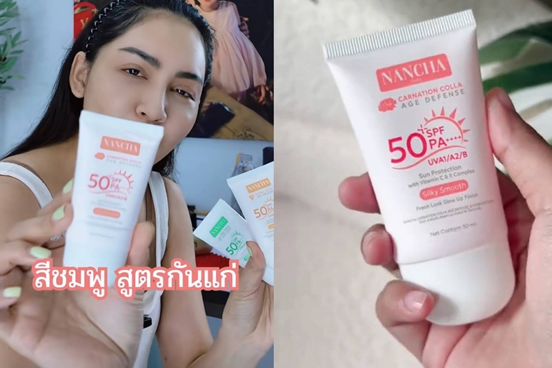 3.นันช่า คาร์เนชั่น คอลล่า เอจ ดีเฟนส์ ซัน โพรเทคชั่น (NANCHA CARNATION COLLA AGE DEFENSE SUN PROTECTION) พัฒนาขึ้นสำหรับผู้ที่มีความกังวลเรื่องริ้วรอย  เนื้อครีมแบบใยไหม ผสานดอกคาร์เนชั่นญี่ปุ่น, Edelweiss ฝรั่งเศส และวิตามิน C&E จากเยอรมนี เนื้อสัมผัสบางเบา ไม่เป็นคราบ ไม่ตกร่อง ใช้ก่อนแต่งหน้าได้ดี เหมาะกับผู้ที่มองหาการดูแลผิวพร้อมกันแดดในขั้นตอนเดียว