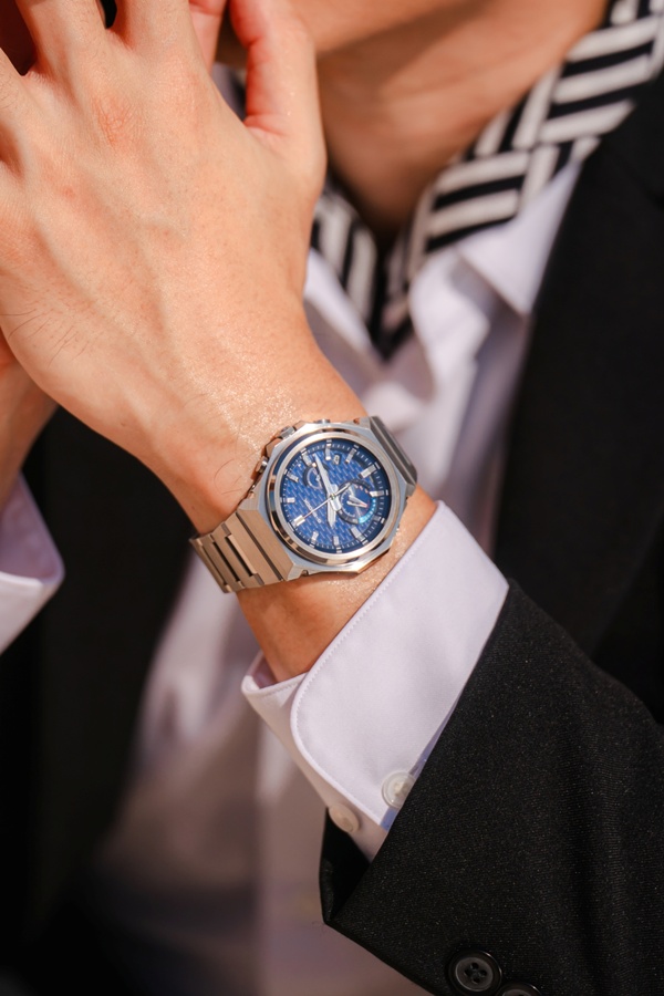 ลวดลายขัดแบบเส้นเดียว (Hairline Finish) โดดเด่นบนพื้นผิวตัวเรือน ขณะที่ขอบตัวเรือนถูกออกแบบให้ ไร้โลโก้ เพื่อสะท้อนความมินิมอลอย่างแท้จริงการผสานเทคนิคขัดผิวแบบ Hairline, Circular และ Mirror Polishing ทำให้เกิดเอฟเฟกต์แสงเงาที่เล่นกับมุมมองอย่างหรูหรา สายสเตนเลสสตีลยังผ่านการขัดผิวอย่างพิถีพิถัน พร้อมตัว