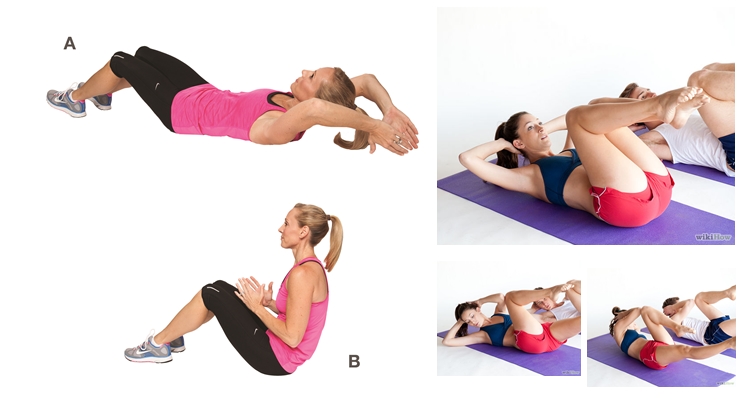 a.. เริ่มด้วยการนอนราบไปบนแผ่นยางหนาสักหน่อย เพื่อกัน กระดูก ทิ่มพื้นชันเข่าขึ้น ให้เท้าราบไปกับพื้น มือประสาน กันไว้ที่ท้ายทอยแล้วยกส่วนก้นขึ้นเนื้อพื้นพอประมาณ พร้อมทั้งกดเกร็งหน้าท้อง แล้วหายใจออกอย่างช้าๆ โดยหลังยัง ติดกับพื้นอยู่ หลังจากนั้นก็ค่อยๆวางลงแล้วหายใจเข้าเป็น การผ่อนคลาย