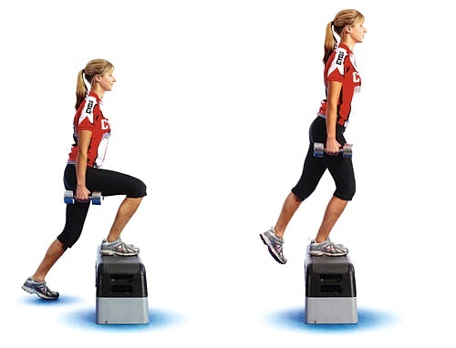 1.. การเหยียบ step up เป็นกิจวัตรประจำวัน โดยถือที่ยกน้ำหนักด้วย สัก 21 ปอนด์ เริ่มต้นด้วยการก้าวยาวๆ ก้าวขาขวาขึ้นสเต็ป เหยียดแขนซ้ายออกไปข้างหน้า แขนขวาวงไว้ขางลำตัวแล้วสลับข้าง ทำอย่างต่อเนื่อง ประมาณ 15 นาที แล้วค่อยๆช้าลง