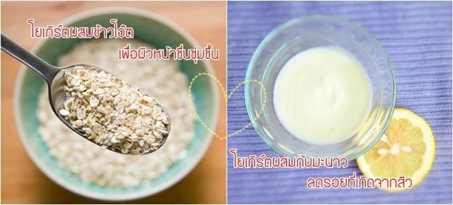 สูตรมาร์คหน้า หากเรานำโยเกิร์ตผสมข้าวโอ๊ตและนำมาพอกหน้าก็จะช่วยให้เรารู้สึกผิวหน้าชื่นชุ่มชื้นขึ้น หรือต้องการลดรอยที่เกิดจากสิวแนะนำให้ใช้โยเกิร์ตผสมกับมะนาวเลยค่ะ