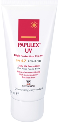 ใหม่ล่าสุดกับ  ..PAPULEX  UV High Protection SPF 47 PA+++..  ครีมกันแดดสูตร Non Comedogenic ไม่ก่อให้เกิดการอุดตันรูขุมขน Non Photosensitizing ไม่ก่อให้เกิดผิวบางไวต่อแดด และไม่หมองคล้ำระหว่างวัน  Paraben Free ปราศจากสารกันเสีย จึงอ่อนโยนแม้ผิวแพ้ง่าย เนื้อครีมบางเบา ซึมซาบเร็ว ไม่เหนียวเหนอะหนะ   ให้ความชุ่มชื่นไม่แห้งกร้านยาวนานด้วยเชียร์ บัตเตอร์  พร้อมการปกป้องผิวจากรังสี UVA และ UVB  ด้วย SPF 47 และ PA +++   อันเป็นสาเหตุของริ้วรอยและความหมองคล้ำ  อีกทั้งยังช่วยป้องกันสิวและปรับผิวให้กระจ่างใส ด้วย EU Patented ABA 3%  + Advance Vitamin B3 4% โดยผ่านการทดสอบจากแพทย์ผู้เชี่ยวชาญด้านผิวพรรณ  จึงเหมาะสำหรับผู้มีปัญหาสิวและผิวมันโดยเฉพาะ