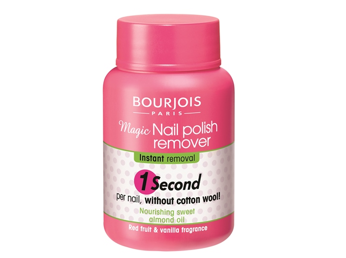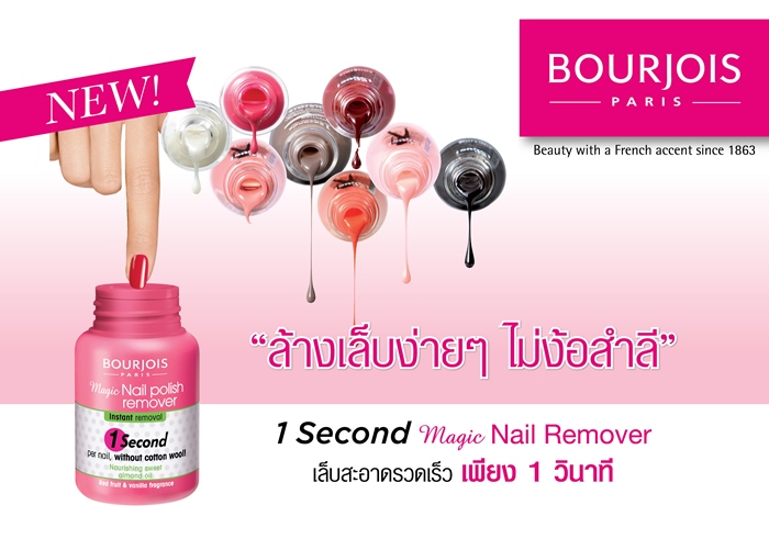 BOURJOIS (บูร์ชัวร์) เมคอัพแบรนด์ชื่อดังจากประเทศฝรั่งเศส ภายใต้การนำเข้าของ บริษัท ลัคซ์ เอเชีย (สยาม) จำกัด ขอแนะนำ บูร์ชัวร์ วัน เซคเคิน เมจิค เนล รีมูฟเวอร์ (Bourjois 1 Second Magic Nail Remover) มหัศจรรย์แห่งการล้างเล็บ ให้คุณล้างเล็บได้สะดวกและรวดเร็ว เพียง 1 วินาทีต่อเล็บ แค่จุ่มนิ้วมือลงบนฟองน้ำในขวด แล้วบิดซ้ายขวาให้ฟองน้ำถูบริเวณเล็บ เพียงเท่านี้ เล็บของคุณก็สะอาดสวยได้ง่ายๆ โดยไม่ต้องใช้สำลีเช็ดสีทาเล็บออกจากนิ้วมือด้วยตนเอง ช่วยให้คุณประหยัดเวลา และรู้สึกสนุกไปกับการทาเล็บ ไม่ต้องเสียเวลากับการล้างเล็บเพื่อเปลี่ยนเฉดสีใหม่อีกต่อไป ผสมน้ำมันสวีทอัลมอนด์ (Sweet Almond Oil) คงความชุ่มชื่นแก่ผิวรอบเล็บ หอมกลิ่นวานิลลาอ่อนๆ ปราศจากสารอะซิโตน (Acetone Free) จึงไม่ทำลายผิวหน้าเล็บและไม่ทำให้ผิวแห้งตึง