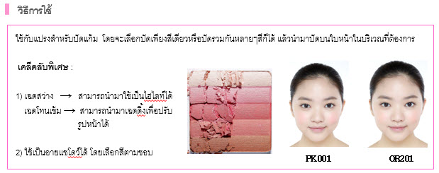 - บลัชเชอร์ที่ผ่านกรรมวิธีอบ ซึ่งจะให้ความเป็นธรรมชาติและสว่างใสบนใบหน้า โดยไม่มีการหลุดร่วงของบลัชเชอร์ระหว่างวัน