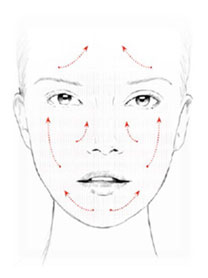 ขั้นตอนที่ 2: ลูบไล้ครีมบนใบหน้า ทิศทางตามลูกศรในภาพให้ทั่วใบหน้า เสมือนหนึ่งกำลังมาส์กหน้า