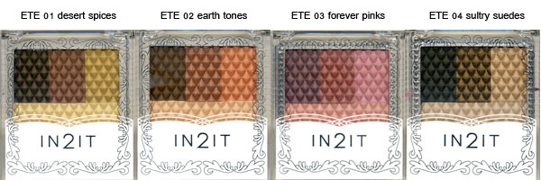 อาย ชาโดว์ สูตรกันน้ำ เนื้อเนียนนุ่มดุจใยไหมให้สีเข้มเด่นชัดและติดทนนาน ในโทนสีคลาสสิค เรียบหรู เหมาะกับทุกโอกาส สามารถทาสีเดียวหรือไล่เฉดสี ให้กลมกลืนดูมีมิติ สารสกัดจากมะม่วงป่า (wild mango) และ vitamin E ช่วยเพิ่มความชุ่มชื้น ให้แก่เปลือกตา บรรจุในตลับสวย กระทะรัด พร้อมแปรงและกระจกในตัว มีทั้งหมด 4 เฉดสีให้เลือก ETE 01 desert spices, ETE 02 earth tones, ETE 03 forever pinks, ETE 04 sultry suedes
