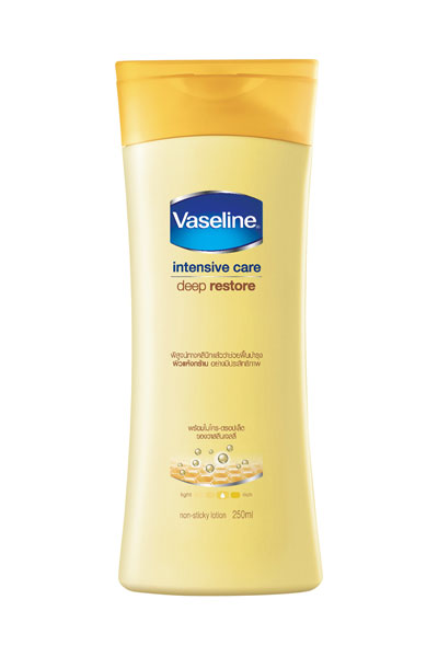 "วาสลีน อินเทนซีฟ แคร์ ดีพ รีสโตร์" (ขวดสีเหลือง) ครั้งแรกกับผลิตภัณฑ์บำรุงผิวกายที่ผสาน "ไมโคร-ดรอปเล็ต" จาก วาสลีน ปิโตรเลียมเจลลีที่ได้รับการยอมรับในการเป็นสุดยอดผลิตภัณฑ์ฟื้นบำรุงผิวสารพัดประโยชน์จากทั่วโลกมายาวนานกว่า 140 ปี เนื้อโลชั่นซึมซาบเข้าสู่ผิวอย่างรวดเร็ว ไม่เหนียวเหนอะหนะ ช่วยฟื้นบำรุงผิวแห้งเสียอย่างล้ำลึกให้ผิวนุ่มชุ่มชื่นตลอดวัน ให้คุณดูมีผิวสุขภาพดียิ่งขึ้นจนคุณสัมผัสได้