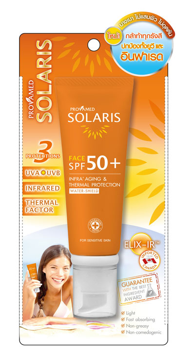 โปรวาเมด เวชสำอางชั้นนำ ผู้เชี่ยวชาญด้านการบำรุงผิวหน้าอย่างลึกซึ้ง แนะนำผลิตภัณฑ์ใหม่ โปรวาเมด โซลาริส เฟซ SPF 50+ (Provamed Solaris Face SPF 50+) นวัตกรรมล่าสุดที่รวมส่วนผสมประสิทธิภาพสูงให้การปกป้องครอบคลุมอย่างสมบูรณ์แบบกว่าที่เคยมีมา ด้วยส่วนผสมที่ประกอบด้วย  Infra’ Aging Protection ปกป้องผิวจากอินฟาเรด รังสีที่ทำลายชั้นผิวได้ลึกกว่ารังสีอื่น กระตุ้นให้เกิดอนุมูลอิสระในชั้นผิว ทำให้การสร้างคอลลาเจนลดลง เกิดริ้วรอยลึกที่เรียกว่า Infra’ Aging, UVA/UVB Protection ป้องกันรังสีอัลตร้าไวโอเลตที่ตรงเข้าทำร้ายผิวจนเกิดเป็นจุดด่างดำ ฝ้ากระ การไหม้เกรียมของผิว จนอาจนำไปสู่การเกิดมะเร็งผิวหนัง, Thermal Protection เป็นเกราะป้องกันผิวจากรังสีความร้อน ที่ตรงเข้าทำลายถึงชั้นผิว สะสมจนเกิดการอักเสบระดับโมเลกุล, Light & Non Greasy เนื้อสัมผัสบางเบา มอบการปกป้องยาวนานต่อเนื่องแม้มีเหงื่อหรือน้ำ ให้พร้อมกับทุกกิจกรรมกลางแจ้งอย่างมั่นใจ ขนาด 50 มล. ราคา 325 บาท
