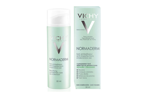 วิชี่ นอร์มาเดิร์ม บิวตี้ฟายอิ้ง แอนตี้-เบลมมิช แคร์ (Vichy Normaderm Beautifying Anti-Blemish Care) ครีมบำรุงผิวหน้า สำหรับผิวมันและผิวมีแนวโน้มเป็นสิวง่าย ด้วยส่วนผสมของ Salicylic Acid และ LHA ที่จะช่วยผลัดเซลล์ผิว พร้อมควบคุมความมัน ซึ่งเป็นสาเหตุของการสะสมเชื้อโรค ช่วยลดความมัน พร้อมกระชับรูขุมขน และลดรอยดำที่เกิดจากสิว จากผลทดสอบในห้องปฏิบัติการพบว่าหลังการใช้อย่างต่อเนื่อง ปัญหาสิวลดลง รอยสิวแลดูลดเลือนลง รูขุมขนดูกระชับขึ้น2 และสีผิวแลดูสม่ำเสมอหลังใช้เพียง 10 นาที1 เผยผิวสวยดูเปล่งปลั่ง ชุ่มชื่นยาวนานตลอดวัน ปริมาณสุทธิ 50 มล. ราคา 950 บาท