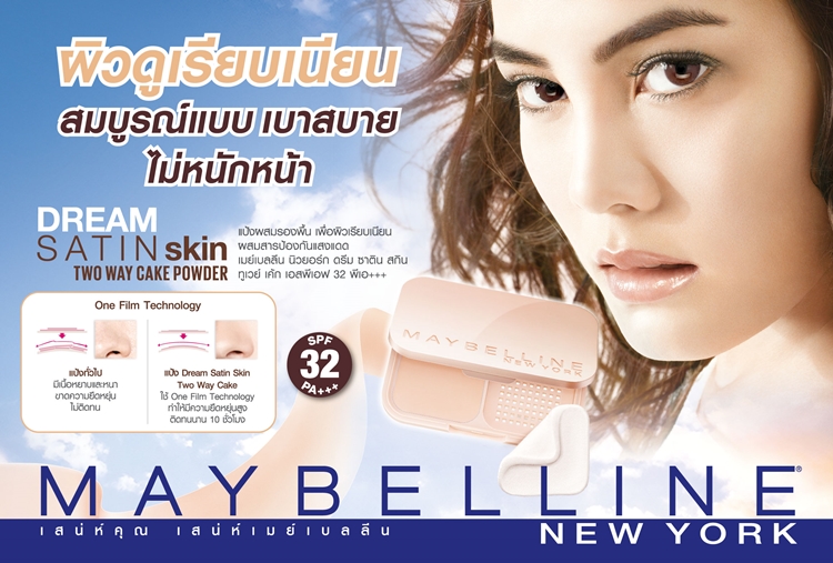ครั้งแรกกับการเปิดตัวของแป้งที่ให้ผิวสุดเนียนดุจซาติน ให้ผิวเนียนสวยเพอร์เฟค ไม่หนักหน้า! กับเมย์เบลลีน ดรีม ซาติน สกิน ทูเวย์ เค้ก เอสพีเอฟ 32 พีเอ+++(Maybelline Dream Satin Skin Twoway Cake SPF32 PA+++) แป้งผสมรองพื้นเนื้อบางเบาดุจกำมะหยี่ที่จะมาเนรมิตผิวคุณให้เรียบเนียน สวยเป๊ะแบบนางฟ้า ด้วยคุณสมบัติที่เหนือกว่าผสานกับนวัตกรรมสุดล้ำ วัน ฟิล์ม เทคโนโลยี (One Film Technology) ที่มีอนุภาคขนาดเล็กเนียนละเอียด เน้นการปกปิดแบบชั้นฟิล์มเดียวบางเบากว่าแป้งธรรมดาทั่วไปถึง 5 เท่า ปกปิดเนียนสนิททุกรูขุมขน ด้วยเนื้อแป้งที่ให้ความยืดหยุ่นสูงช่วยให้คุณยิ้มและหัวเราะได้อย่างเต็มที่และไม่ทำให้เกิดเหตุการณ์แป้งแตกเป็นผุยผงอย่างแน่นอน และนอกจากนี้ยังให้เนื้อสัมผัสที่บางเบาดุจกำมะหยี่ ให้ผิวหน้าเบาสบาย เผยผิวสวยสมบูรณ์แบบได้ตลอดวัน