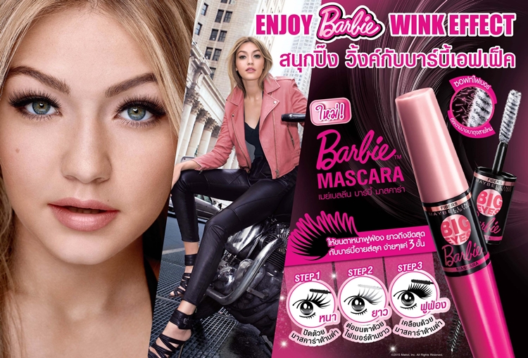 ใครว่ามีดวงตาสวยโดดเด่นอย่างบาร์บี้จะต้องเป็นสาวหวานเสมอไป เมย์เบลลีน นิวยอร์ก แบรนด์เครื่องสำอางอันดับหนึ่งของโลก ได้เปิดตัว เมย์เบลลีน บาร์บี้ มาสคาร่า (Maybelline Barbie Mascara) มาสคาร่า 2 หัวแปรงใหม่ล่าสุด ที่จะฉีกลุคหวานๆของสาวน้อยบาร์บี้แบบที่เคยมี แล้วมาท้าลองให้สนุกซ่ากับดวงตากลมโตสุด วิ้งค์ กระชากใจ ด้วยการครีเอท บาร์บี้ลุคในสไตล์ของคุณเอง ไม่ว่าจะเป็นมาดเท่ เปรี้ยวซ่า หรือว่าเซ็กซี่ ลุคไหนๆก็ทำได้ทั้งนั้น วิธีสนุกปิ๊ง วิ้งค์กับบาร์บี้เอฟเฟ็คนั้นง่ายมากแค่เพียง 3 ขั้นตอน! สนุกแรก มาสคาร่าด้านดำปัดขนตาให้หนาเสมือนเบสขนตา สนุกสอง มาสคาร่าด้านขาวปัดขนตาให้ยาวขึ้น และสนุกสาม ปัดมาสคาร่าด้านดำซ้ำอีกครั้งให้ขนตา หนา ยาว ฟูฟ่องถึงขีดสุด!