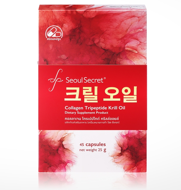 คอลลาเจน ไตรเปปไทด์ คริลล์ออยล์ บาย โซล ซีเครท (Collagen Tripeptide by Seoul Secret) ผลิตภัณฑ์อาหารเสริมผิวคอลลาเจน สูตรใหม่! ช่วยคงความอ่อนเยาว์ของผิวพรรณ ผลิตจากคอลลาเจนไตรเปปไทด์ มีขนาดโมเลกุลเล็กพิเศษจึงสามารถดูดซึมง่ายและเร็วกว่าคลอลาเจนทั่วไป พร้อมส่วนผสมจากสารสกัดสำคัญมีประโยชน์ต่อร่างกาย อาทิ แอสตาแซนธิน (Astaxanthin) ใน Krill Oil โรสพาเซนต้า วิตามินซี และวิตามินอี ช่วยเรื่องการต้านอนุมูลอิสระต่างๆ ที่พบเจอในชีวิตประจำวัน วัตถุดิบที่ใช้นำเข้าจากเกาหลี ซึ่งมีมาตรฐานรองรับและปลอดภัยจากผู้บริโภค ช่วยเปลี่ยนผิวหมองให้เป็นผิวสวยสุขภาพดีอ่อนเยาว์