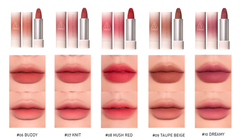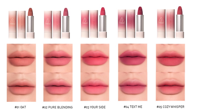 3CE Cashmere Hug Lipstick เปิดตัวด้วย 10 เฉดสีสุดพิเศษที่รังสรรค์อย่างลงตัว เหมาะกับทุกสไตล์ สามารถทาแบบเต็มริมฝีปากหรือไล่เฉดสีได้อย่างสวยงาม พร้อมมอบสัมผัสเนียนนุ่ม สบายปาก เฉดสีทั้งหมดถูกจัดออกเป็น 3 โทนหลัก ได้แก่