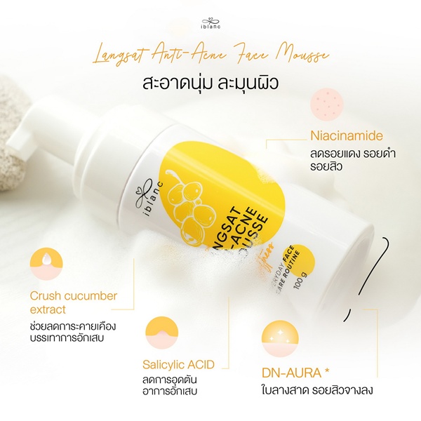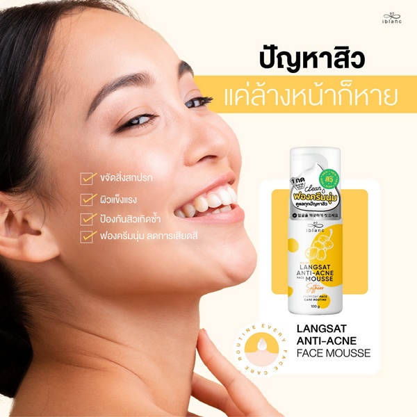 สำหรับใครที่อยากมีผิวใสไกลสิว ผิวอิ่มฟู แบบฉบับของหนุ่มสาววัยทีน ขอแนะนำ “ไอบลองก์ ลางสาด แอนตี้-แอคเน่ เฟส มูส” ผลิตภัณฑ์ทำความสะอาดผิวหน้า เคลียร์ปัญหาสิวเรื้อรังอย่างได้ผล ฟองครีมนุ่มสูตรอ่อนโยน เหมาะสำหรับทุกสภาพผิว ช่วยทำความสะอาดผิวได้อย่างหมดจด พร้อมเติมความชุ่มชื้น ล็อคผิวอิ่มฟู ไม่แห้งกร้าน ด้วยสารสกัดหลักจากใบลางสาดที่คัดมาเพื่อคนเป็นสิวโดยเฉพาะ ช่วยลดปัจจัยการเกิดสิว ฝ้า กระ จุดด่างดำ บอกลาปัญหาสิวเรื้อรังและสิ่งสกปรกตกค้าง ซึ่งเป็นต้นเหตุของการเกิดสิวได้อย่างมีประสิททธิภาพ และด้วยค่า PH 5.5 ช่วยรักษาสมดุลที่เหมาะสม ไม่ทําลายกลไกธรรมชาติในการปกป้องผิว ช่วยเสริมเกราะป้องกันผิวให้แข็งแรง ไม่มีแอลกอฮอล์ ซิลิโคน พาราเบน สี น้ำหอม และมิเนอรัลออยล์ SLS และ SLES) เพียงใช้เป็นประจำทุกวันจะช่วยให้ผิวเรียบเนียนนุ่มน่าสัมผัสและดูสดใสขึ้นในทุกๆวัน