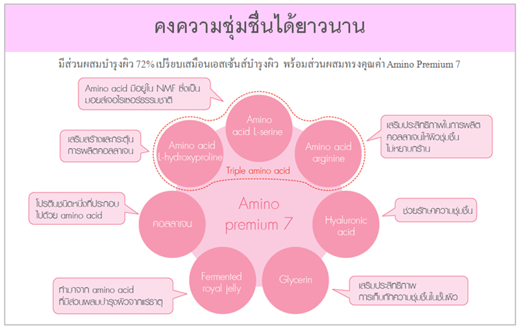 • ผิวหน้าคงความชุ่มชื่นได้ยาวนาน ไม่แห้งกร้านด้วยส่วนผสมบำรุงผิว 72% เสมือนเอสเซ้นส์ พร้อมด้วยส่วนผสมทรงคุณค่า Amino Premium 7