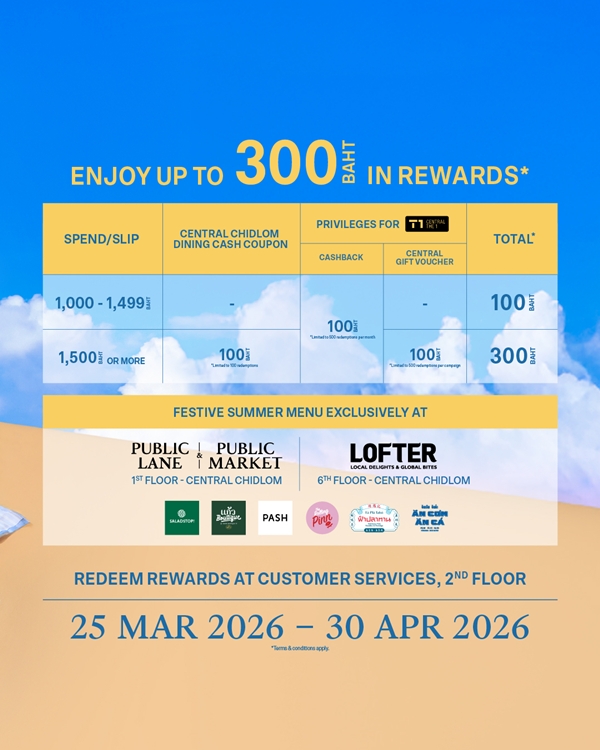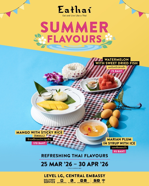 เติมเต็มความสนุกด้วยความอร่อย ความสดชื่นพร้อมบรรยากาศสนุกที่ Eathai ชั้น LG เสริมสิริมงคลด้วย กิจกรรม สรงน้ำพระ วันที่ 10 – 15 เมษายน 2569 เติมเต็มความสนุกโดย Live DJ TukTuk Radio วันที่ 12 – 13 เมษายน 2569 เวลา 12.00 – 14.00 น. และ 17.00 - 19.00 น. สดชื่นรับหน้าร้อนกับ Summer Flavours เสิร์ฟเมนูไทยคลายร้อนสุดพิเศษ อย่างแตงโมหน้าปลาแห้ง ข้าวเหนียวมะม่วง และมะยงชิดลอยแก้ว ตลอดเดือน และพลาดไม่ได้กับความอร่อยสุดเอ็กซ์คลูซีฟ เพียงสั่งอาหารและเครื่องดื่มครบ 400 บาทต่อใบเสร็จ รับฟรี! “ขนมชั้นลายผ้าไทย” ที่สะท้อนเอกลักษณ์วัฒนธรรมไทย (จำนวนจำกัด 60 สิทธิ์) วันที่ 12 – 14 เมษายน 2569
