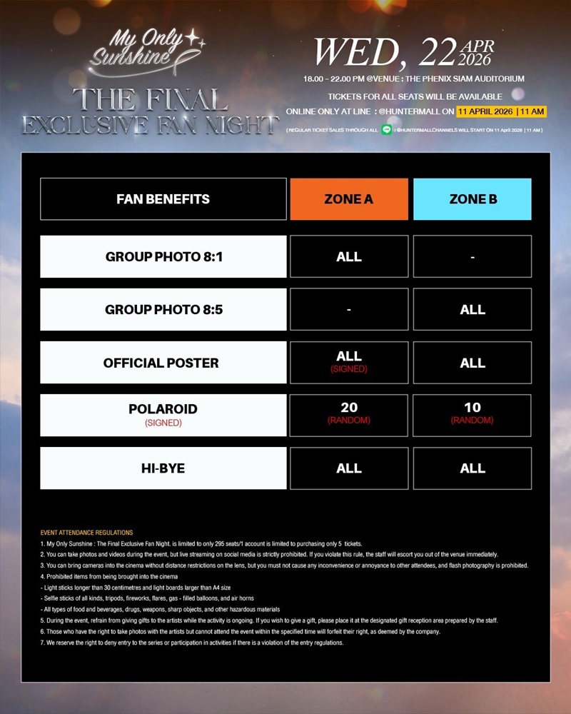 วอร์มนิ้ว! ล็อคเวลากดบัตร มีจำนวนจำกัด แล้วมาร่วมลุ้นบทสรุปความรักของคนทั้งคู่ไปด้วยกัน กับงาน "My Only Sunshine : The Final Exclusive Fan Night" ในวันพุธที่ 22 เมษายน 2569 เวลา 18.00 - 22.00 น. ณ The Phenix Siam Auditorium โอกาสสุดท้ายที่จะได้ฟินพร้อมกันแบบจอยักษ์มาถึงแล้ว!