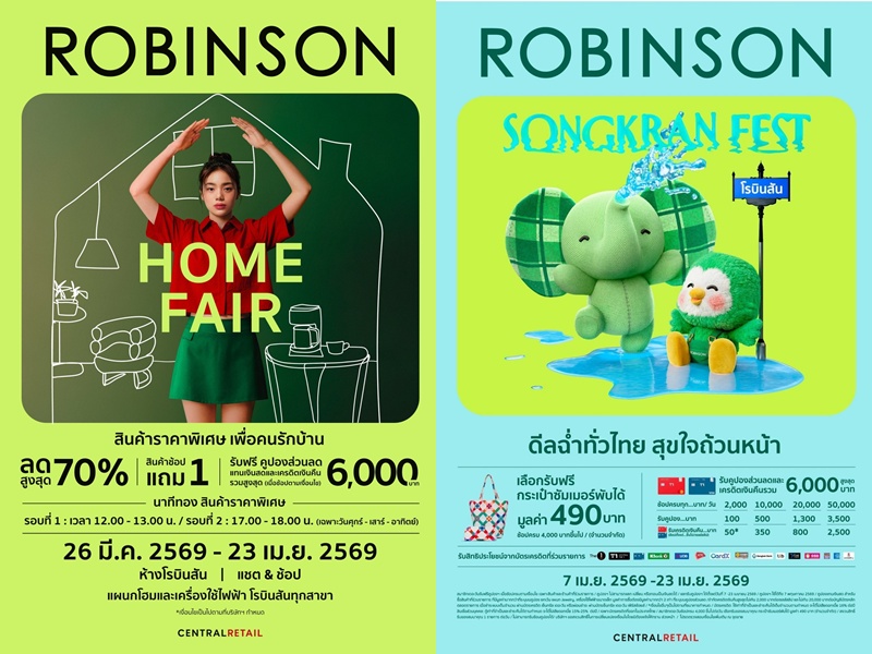 ห้างสรรพสินค้าโรบินสัน ในเครือเซ็นทรัล รีเทล ต้อนรับเทศกาลสงกรานต์ 2569 จัดแคมเปญ "ROBINSON SONGKRAN FEST" ในคอนเซ็ปต์ ‘ดีลฉ่ำทั่วไทย สุขใจถ้วนหน้า’ ชวนทุกครอบครัวช้อปไอเทมซัมเมอร์ที่มาพร้อมโปรโมชันสุดคุ้ม พร้อมชิลไปกับกิจกรรมสร้างสีสันที่ผสานความเป็นไทย ตอกย้ำการเป็น "จุดหมายที่สร้างความสุขในทุก ๆ วันของชีวิต" ระหว่างวันที่ 7 - 23 เมษายน 2569 ที่ห้างสรรพสินค้าโรบินสันทุกสาขา และทุกช่องทางการช้อปปิ้งสุดสะดวกของห้างฯ